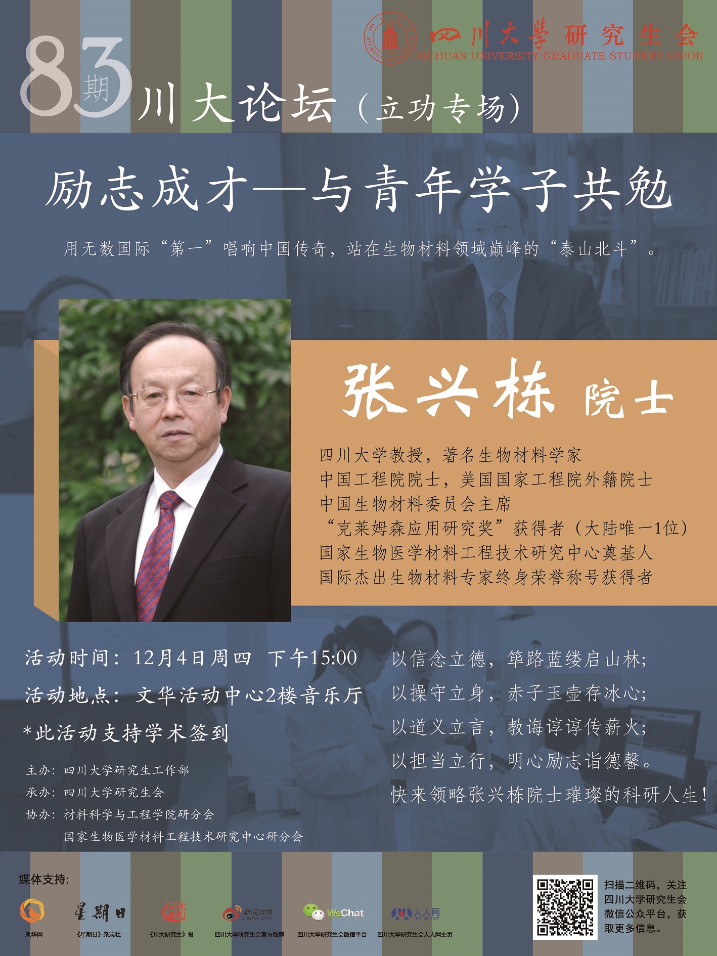beat365中文官方网站第83期“川大论坛”——“立德•立言•立功”系列讲座拉开帷幕!生物材料领域的殿堂级人物,川大瑰宝、中国璞玉、学术泰斗,中国工程院院士兼美国工程院外籍院士——张兴栋院士即将做客第83期川大论坛,开启“立功篇”!