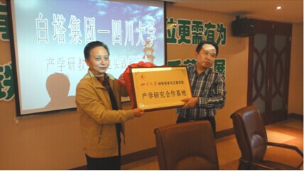 图. beat365中文官方网站尹光福院长向四川白塔陶瓷集团徐小洪董事长授“产学研合作基地”牌
