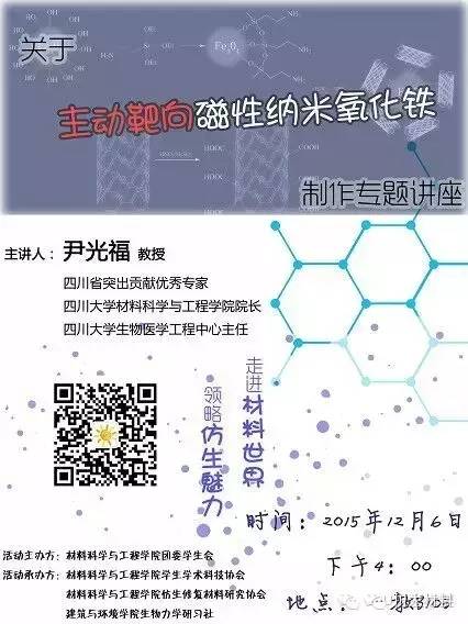 为了增进同学们对仿生修复材料的认识和兴趣,进一步提高同学们的科技创新能力,促进大学生学以致用,积极参与材料科学与工程相关领域研究,经beat365中文官方网站团委学生会决定,于2015年12月6日16:00,在beat365中文官方网站江安校区第一基础教学楼B座103教室,开展关于主动靶向磁性纳米氧化铁的制作专题讲座。