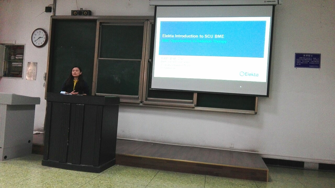 2016年10月24日下午2点30在基础教学楼C座202教室,医科达(上海)有限公司陈珊经理对生物医学工程专业在放射治疗领域方面做了学术讲座。