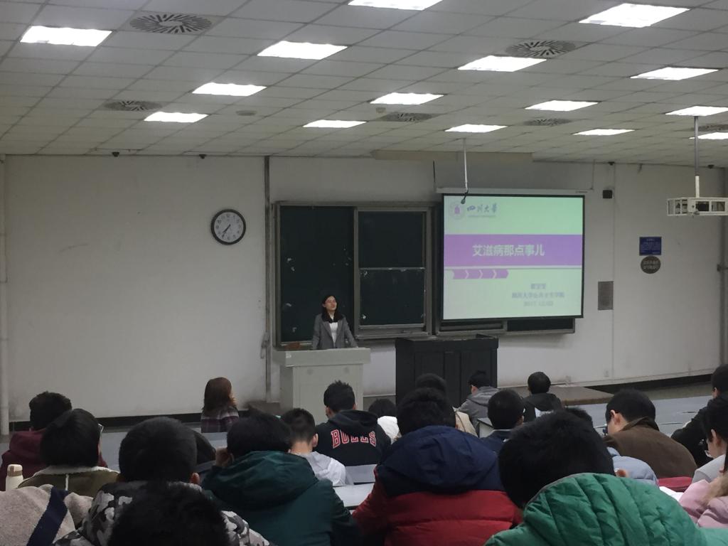 12月1日是第30个世界艾滋病日,在“共担防艾责任,共享健康权利,共建健康中国”的主题号召下,2017年12月3日晚上7:30在望江校区基础教学楼C座201室,beat365中文官方网站华西公共卫生学院研究生翟雯雯同学向在座的近200名beat365中文官方网站学子进行了“艾滋病的那些事儿”的讲座,整个讲座分为四个部分,一、艾滋病基本情况;二、防艾过程的一些误区;三、预防艾滋病的ABCDE原则;四、艾滋病到底可不可怕?