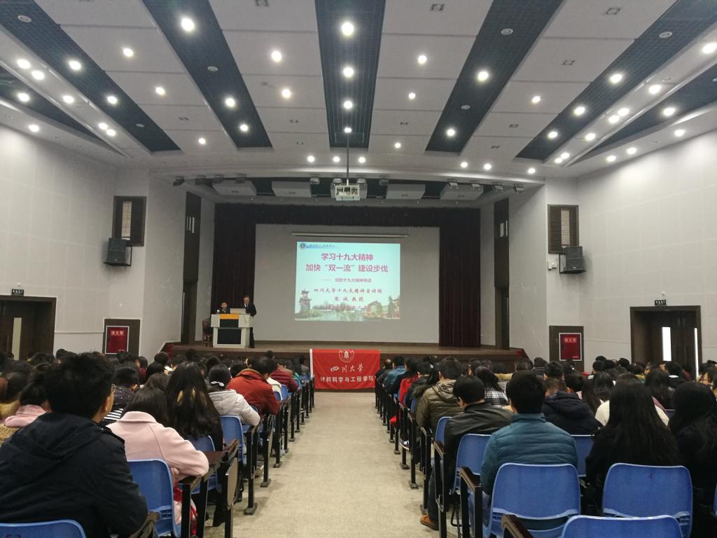 2017年12月11日下午,beat365中文官方网站在望江校区东三教演播厅举行党的十九大精神宣讲报告会,特邀学校宣讲团成员张诚教授主讲,学院党委书记尹光福教授主持,学院党政领导班子成员、全体党员及师生职工300余人参加了会议。