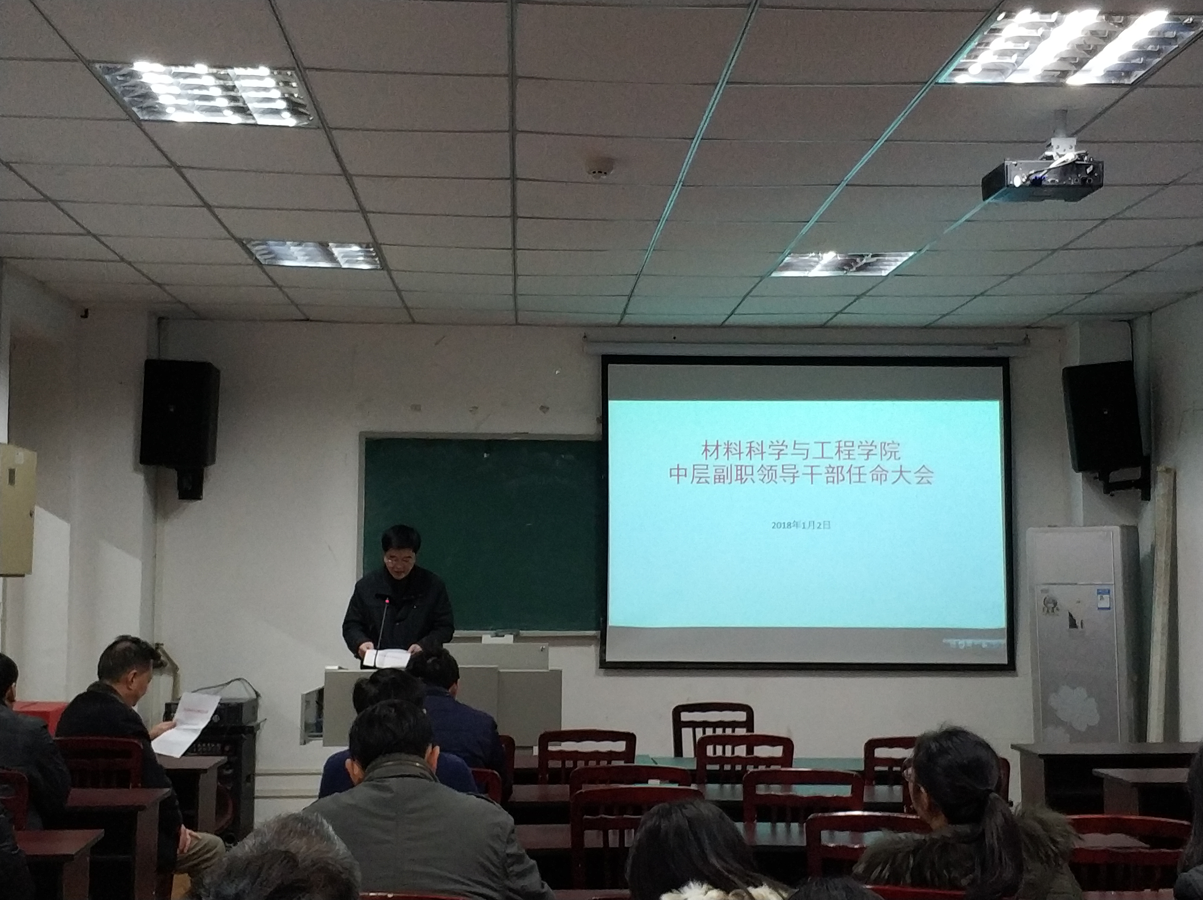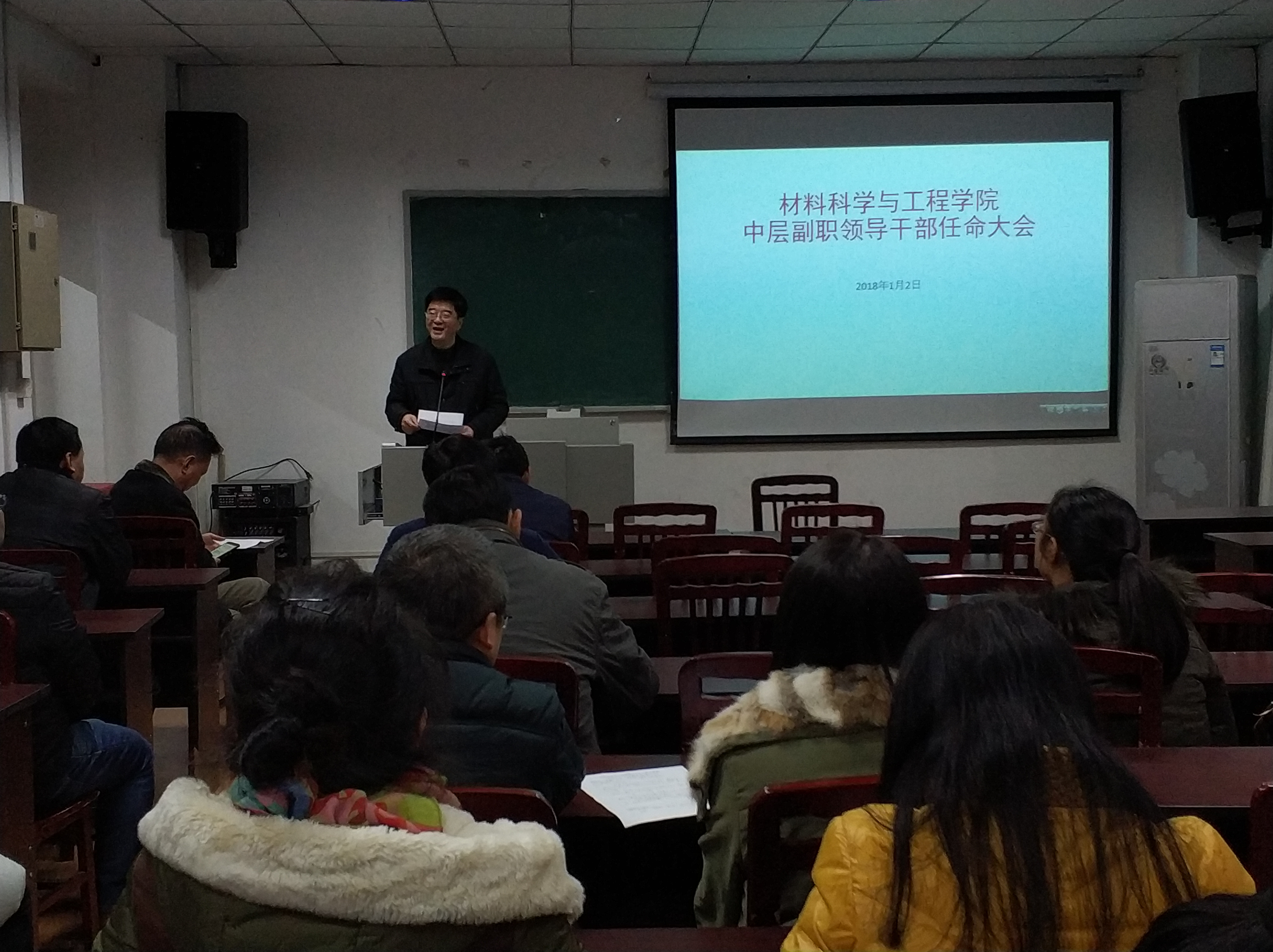 2018年1月2日下午4:30,beat365中文官方网站在第一理科楼209召开了中层副职干部任命大会,全体在职教职工参加了会议,校党委副书记李旭锋教授出席大会并发表讲话,会议由学院党委书记尹光福教授主持。