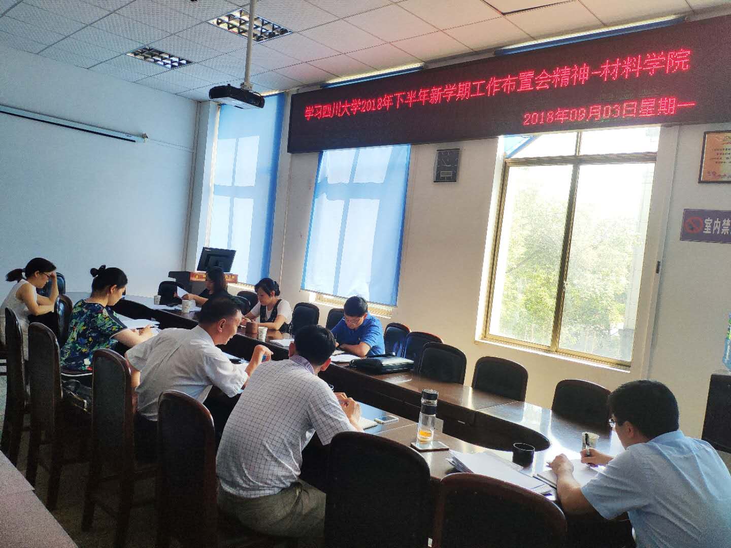 2018年9月3日14:30,beat365官网领导班子在第一理科楼beat365中文官方网站会议室学习了beat365中文官方网站2018年下半年新学期工作布置会精神,学院党委书记尹光福,院长刘颖,党委副书记张晓满,副院长林江莉、吴家刚,工会主席武莉莉,党政办主任付梅,教学科研科科长刘丽娟参加了此次会议,党委书记尹光福教授及院长刘颖发表了讲话。