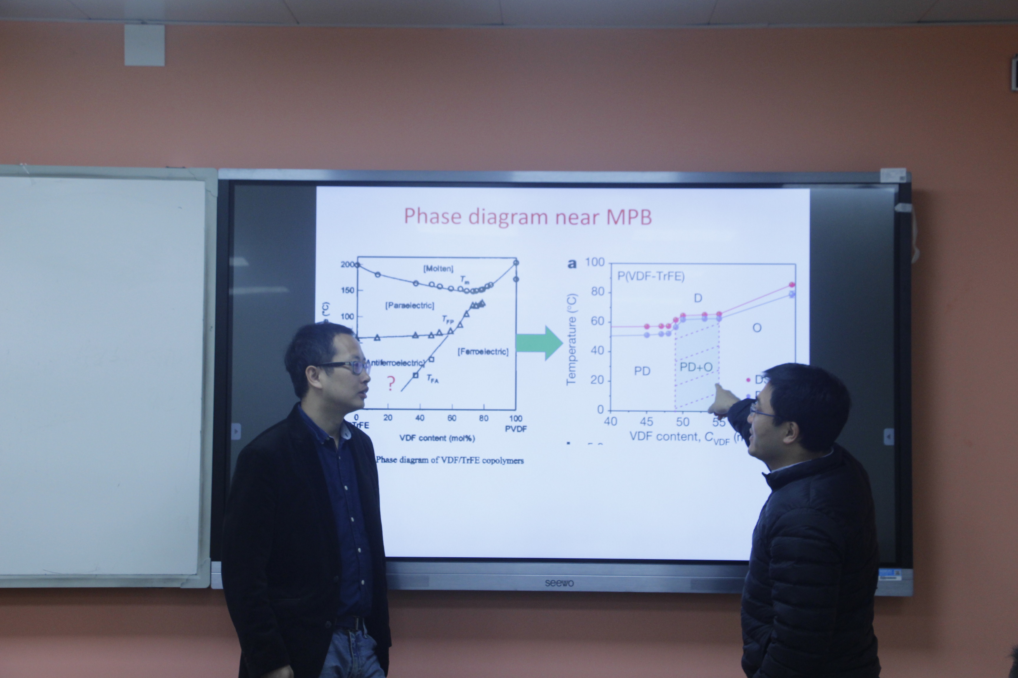 报告中,刘洋博士生动地向大家介绍了在准通型相界附近材料能够获得优良的介电和压电性能,并且将此概念成功应用到铁电聚合物有机材料中。刘洋博士的报告从准同型相界机制出发,具体讲解了如何在聚合物材料结合其特殊化学结构设计准同型相界,这将对未来提升有机压电材料压电性能提供新的思路。此外,刘洋博士还详细地描述了自己在设计材料时的思路,为现场研究生们提供了一些思路上的指导。
