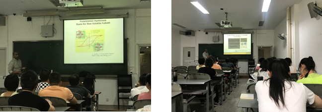 Nagarajan教授首先由铁电体中的缺陷引入讲座主题,聚焦铁电体畴壁的存储效应,向大家展示了一种特殊的铁电体畴壁的记忆功能,而非传统的畴结构的记忆效应。Nagarajan教授通过PPT向大家展示了一种可扩展到100nm尺寸以下的非易失性铁电畴壁存储器,通过畴壁的两种存在状态作为开关,这种器件可以在适当的电压下进行可持续读取,具有极高的可控性,同时又具有良好的耐久性和多级数据存储能力。上述研究推动了集成纳米级铁电畴壁存储器领域的进步。在讲座的后半部分,Nagarajan教授介绍了一种超薄铁电薄膜中的纳米级气泡畴,并给出了在PZT/ST/PZT三明治结构中观察到的气泡畴。通过压电力显微镜和透射电镜,在这种结构中可以观察到局部的偶极子与周围铁电矩阵的宏观极化效应相反,从而导致了局部的极化反转,使得气泡畴壁具有特殊的特征。Nagarajan教授时而严肃,时而幽默,引起了在座同学的共鸣。