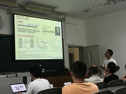 讲座结束后,师生们积极提问,对讲座中的有趣现象进行了探讨。随后,吴家刚教授课题组的同学与Nagarajan教授进行了更深入的学术交流,向Nagarajan教授介绍了本课题组的最新研究成果。吕想博士研究生以铌酸钾钠基压电材料为主,介绍了课题组近年取得的学术成果,并与Nagarajan教授进行了深入讨论。殷杰博士研究生以钛酸铋钠基压电材料为主,介绍了课题组在该类材料的最新研究进展。Nagarajan教授与课题组师生热烈讨论,并针对目前存在的一些科研难题提供了建议。