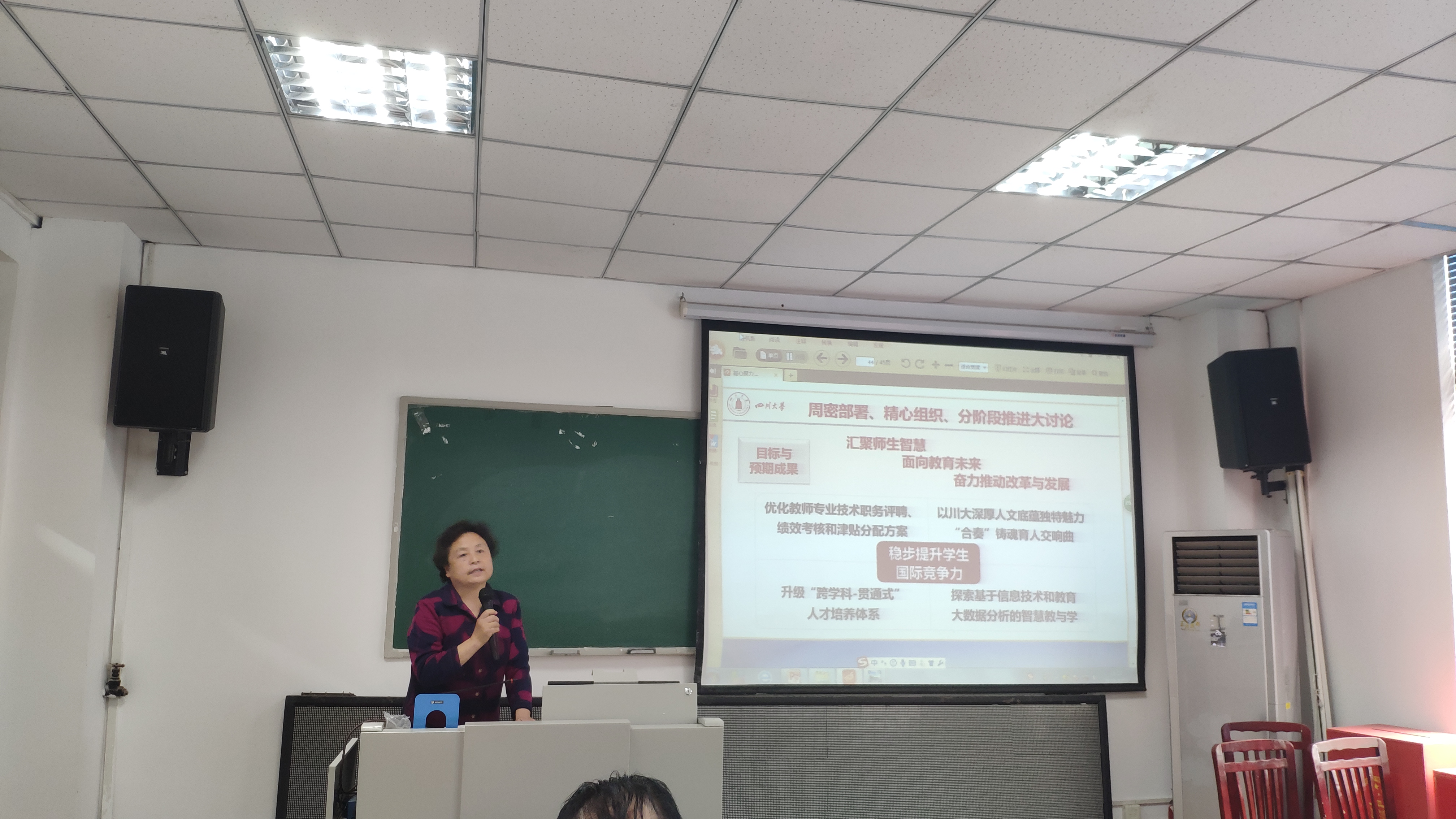 随后,教学副院长林江莉详细传达了18日beat365中文官方网站新时代本科教育改革与发展大讨论工作部署会的主要精神,林院长指出,我校始终坚持建设“一流大学的核心是培养一流人才,关键要有一流本科”,此次本科教育改革与发展大讨论主要围绕六个方面进行:一是以全过程全课程思政坚守立德树人根本;二是用川大深厚人文底蕴提升思政课程铸魂育人实效;三是以教师发展和教育智能化促进探究式深度学习;四是以“跨学科-贯通式”人才培养构筑川大本科教育新模式;五是推动“双创”教育全方位深度融入人才培养;六是加强学生全球胜任力培养。随后林院长分析了beat365官网本科教育的现状,她谈到学校和学院的发展不进则退,全国高校都在进行本科教育改革,近几年教育部推出了许多强有力的措施促进学校教育教学的改革,比如即将推行的一万个一流专业的建设、以专业为导向的高考招生制度改革。每一个老师一定要认识到促进本科教育的改革和发展,与学校、学院、学科以及每一位老师自身的发展息息相关。最后根据学校的工作部署,结合beat365官网实际情况,林院长对beat365官网本次大讨论工作进行具体的部署。
