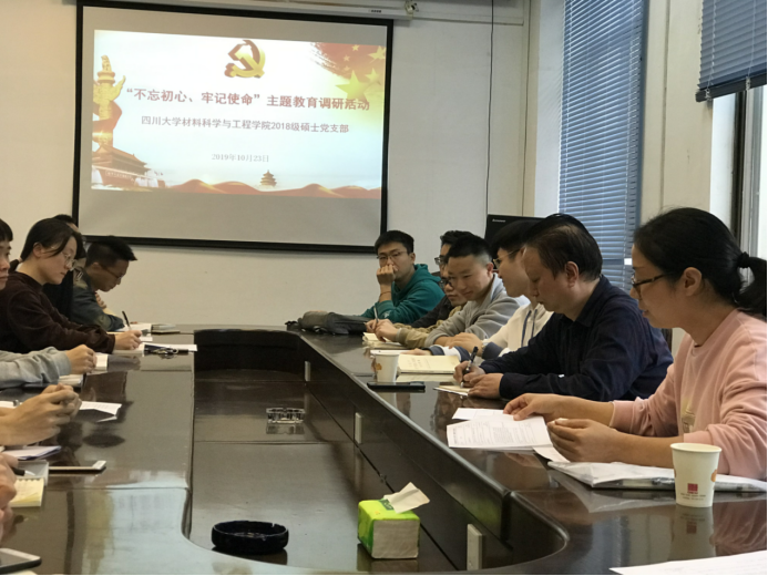为扎实推进“不忘初心、牢记使命”主题教育,2019年10月23日下午两点,beat365官网2018级硕士党支部开展了“不忘初心,牢记使命”主题教育调研活动。beat365中文官方网站党委书记尹光福教授出席会议,党支部书记余艳丽老师主持会议,支部全体党员参会。