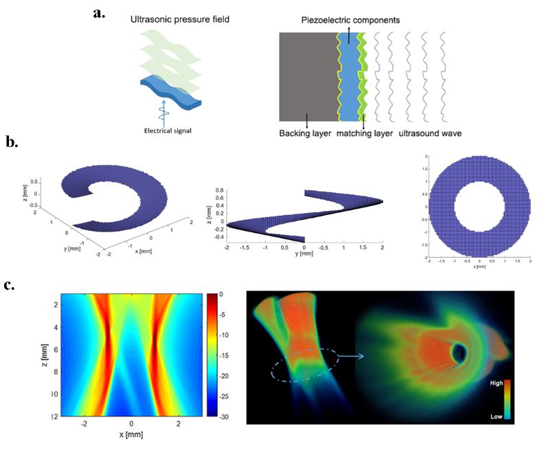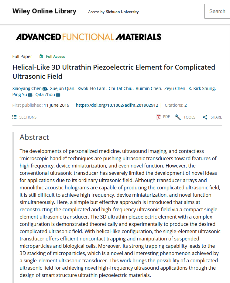 近日,beat365中文官方网站余萍教授团队,与美国南加州大学、香港理工大学合作的“使用3D复杂结构的超薄压电敏感元来构建超声复杂声场的研究”课题相关成果,在国际著名材料期刊Advanced Functional Materials (IF=15.621)以原创性论著形式发表。该工作针对当前超声技术发展的趋势:新功能、高频以及器件微型化,首次提出利用复杂3D结构的超薄压电敏感元实现复杂的高频超声场。论文第一作者是beat365中文官方网站专职博士后陈潇洋,beat365中文官方网站余萍教授和美国南加州大学周岐发教授为共同通讯作者。beat365中文官方网站为该论文的第一署名单位。