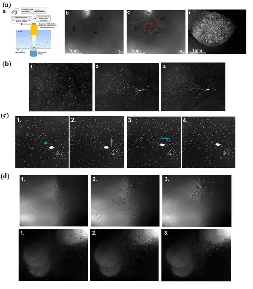 图3: (a) 收集10微米的微粒; (b) 收集3微米的悬浮微米;(c) 对收集的3微米微粒进行水平移动;(d)对FB和HMSC细胞进行收集;