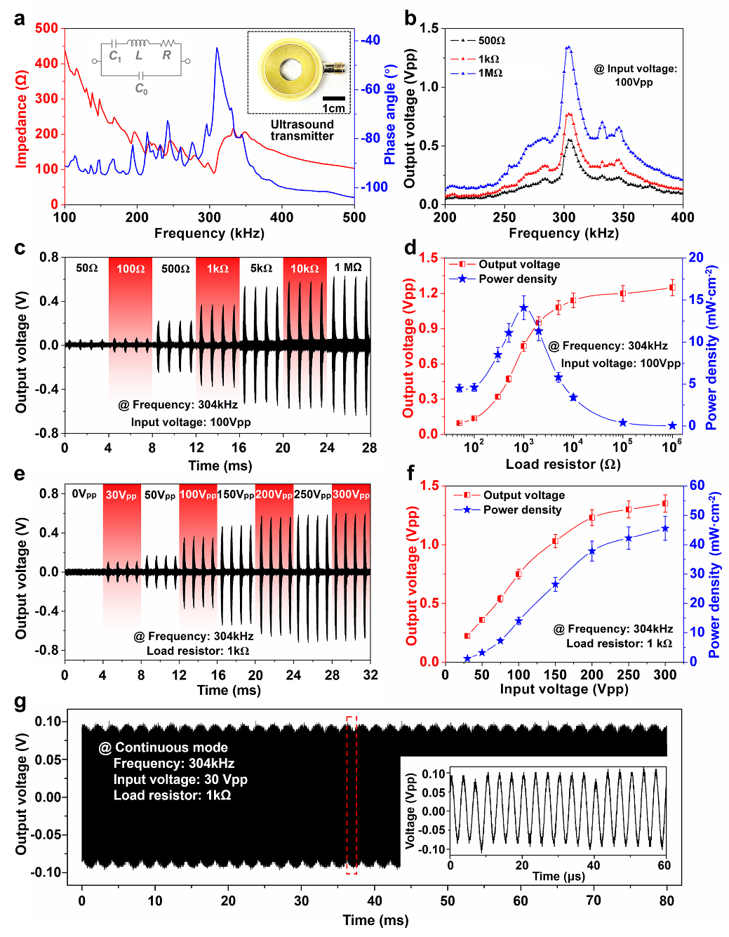 为了测量超声能量采集装置的输出性能,使用多功能测试平台,对LF-PUEH装置进行了系统研究,包括频率特性、输入条件、负载优化以及植入式模拟实验,以评估其输出特性并证明其在潜在应用中的价值。测试的结果表明,在负载为 1 kΩ 时,器件可获得最佳输出特性,最大瞬时功率密度达到45 mW/cm2。