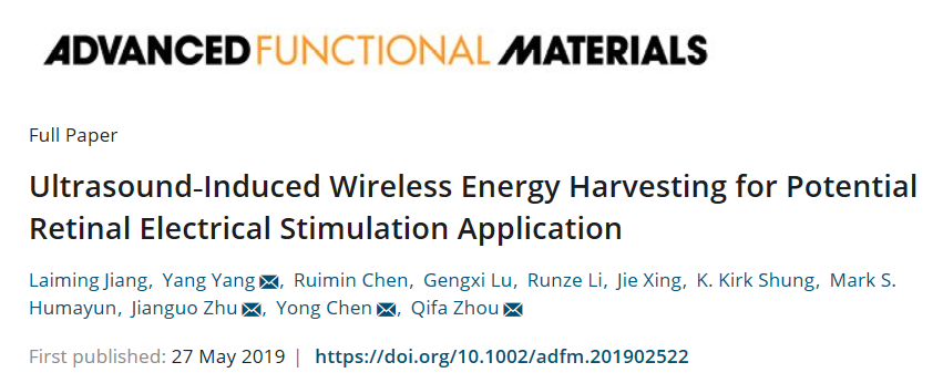 近日,beat365中文官方网站朱建国教授课题组与美国南加州大学周歧发教授团队合作,在KNN基无铅压电材料制备微型超声器件的应用研究方面取得重要进展,相关成果“Ultrasound-induced wireless energy harvesting for potential retinal electrical stimulation application” 以封面论文形式发表在国际顶级期刊Advanced Functional Materials上(《先进功能材料》,影响因子15.621)。该论文第一作者为beat365中文官方网站和美国南加州大学的联合培养博士生蒋来明,朱建国教授为该论文共同通讯作者。
