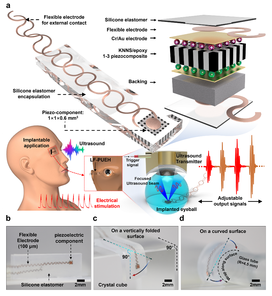 在这项工作中,利用beat365中文官方网站朱建国教授团队研发的性能优良的铌酸钾钠(KNN)基无铅陶瓷,使用改进的切割-填充技术制备了一种具有微结构的对人体生物相容性好的1-3维复合材料来制备微型超声器件,并采用柔性电极设计和有机硅弹性体封装。制备的无铅超声能量采集装置(LF-PUEH)具有改善的声学和电学性能以及与生物组织相似的机械顺应性,不仅能在超声波驱动下实现理想的压电电势输出,而且同时具有环境友好性与高度灵活性,以确保与人体组织的安全和紧密接触。