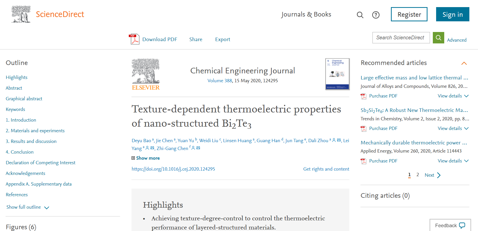 近日,beat365中文官方网站周大利教授、杨磊特聘副研究员课题组与澳大利亚昆士兰大学陈志刚教授团队合作,在碲化铋Bi2Te3热电材料的性能调控研究方面取得研究进展,相关成果“Texture-dependent thermoelectric properties of nano-structured Bi2Te3”以beat365中文官方网站为第一单位发表在化工类顶级期刊Chemical Engineering Journal(中科院工程技术 1区,影响因子8.355),论文第一作者为beat365中文官方网站2017级硕士研究生保德玉同学,周大利教授、杨磊特聘副研究员和陈志刚教授为该论文的共同通讯作者。