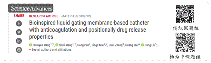 2020年9月5日,beat365官网杨为中教授与厦门大学侯旭教授团队合作,在Science子刊《Science Advances》上合作发表了题为“Bio-inspired Liquid Gating Membrane-based Catheter with Anti-coagulation and Positionally Drug Release Properties”的论文,提出了具有自适应性形变、抗凝血、定点药物释放功能的液体门控医用导管机制。论文第一作者为beat365中文官方网站2018届优秀毕业生、现厦门大学化学化工学院2018级直博生王春燕。厦门大学侯旭教授和beat365中文官方网站杨为中教授为论文共同通讯作者。
