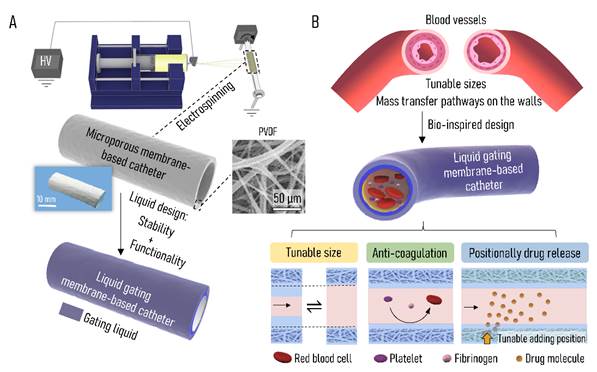 医用导管是插入体内的柔软管道,用于液体引流或微创式医疗器械植入。现有的医用导管有包括用于血液透析的血透管、用于心血管支架等植入的球囊导管以及导尿管等。其主体管道,主要是用聚氨酯、硅橡胶等医用高分子制成的实体管道,以供物质从端口进入从末端输出。这样的医用导管存在一定的局限性,包括无法与植入环境进行互动,缺乏环境适应性;功能性单一以及因外界材料植入引起的血栓、感染等问题。基于此,厦门大学侯旭教授团队与beat365中文官方网站杨为中教授团队合作提出了一种液体门控医用导管,以赋予医用导管环境响应性的动态变化、抗凝血以及定点药物释放功能。