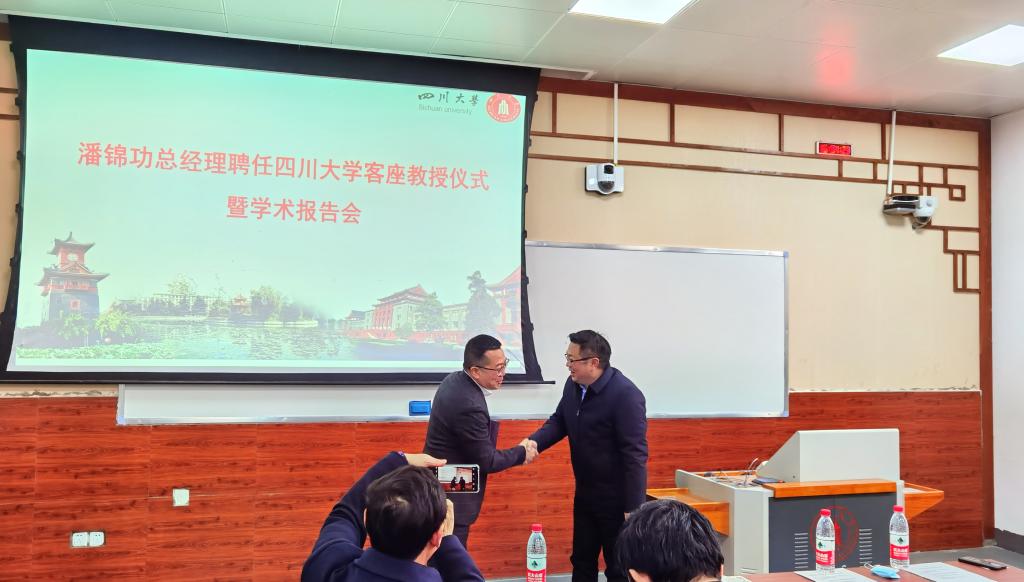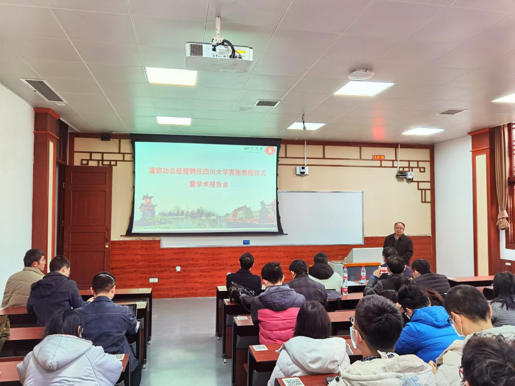 1月15日下午,beat365中文官方网站客座教授聘任仪式在beat365中文官方网站东区第二教学楼101教室隆重举行。政协成都市双流区委员会委员、成都中建材光电材料有限公司总经理潘锦功先生受聘学校客座教授。学校党委副书记郭勇教授、学院党委书记蒋青教授、院长刘颖教授、党委副书记张晓满教授、副院长吴家刚教授、院长助理叶金文教授、朱小红教授、成都中建材光电材料有限公司相关负责人出席授聘仪式。仪式由党委书记蒋青教授主持。