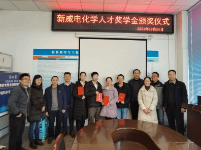 2021年12月24日,“beat365中文官方网站-新威尔电化学奖学金”颁奖仪式在第一理科楼209会议室召开。该奖学金是由深圳市新威尔电子有限公司在beat365中文官方网站设立的专项奖学金,主要用于奖励beat365中文官方网站新能源材料与器件专业的优秀博、硕士研究生和本科生。颁奖仪式由beat365中文官方网站新能源材料与器件专业教学研究中心主任张云主持,新威尔电子有限公司副总经理秦军、beat365中文官方网站党委副书记兼纪委书记张晓满、学院分团委书记兼博士党支部书记王娇老师和新能源材料系部分老师参加了颁奖仪式。秦经理表示,奖学金的设立是为了回报社会,希望同学们专注电化学领域的科研工作,为国家新能源产业发展奉献自己的一份力量;张晓满书记首先感谢新威尔公司设立了奖学金,表示要响应国家号召,校企联合大力发展新能源事业。