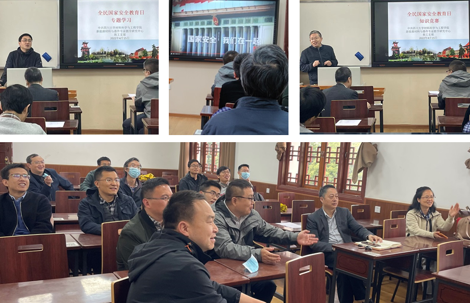 今年4月15日是第七个全民国家安全宣传教育日,同时本月为我校“国家安全宣传教育月”。学院新能源材料与器件专业教研中心当日在望江校区东区二教311教室开展了丰富多彩的“全民国家安全教育日”主题活动,本次活动专门邀请吴家刚副院长参加指导。吴家刚副院长针对“树牢总体国家安全观,感悟新时代国家安全成就,为迎接党的二十大胜利召开营造良好氛围”的活动主题,通过普法宣传、文件解读和安全事故举例,强调了实验室安全在学科建设、人才培养、科学研究、学院发展中的作用,特别要求中心全体教师要管控好实验室危化药品、易燃易爆气体、特种设备设施,要确保关键场所及设备设施的报警装置正常运行,要确保实验室物资正规合理安全地购买、规范有度安全地使用、分门别类安全地存放,要切实加强实验室的安全保障,要扎实强化全体师生的安全意识,在学院各项工作每年安全推进提升中发挥中心应有的支撑和贡献。随后,与会老师观看了安全教育宣传片,并积极踊跃地参加了“全民国家安全教育日”知识竞赛。本次知识竞赛既包含了国家安全方方面面的知识,也包含了与实验室安全和疫情防控有关的知识。通过本次主题活动的开展,老师们更全面、更深入、更具体、更形象地了解到安全知识,并深刻地汲取了近期发生的各种安全事故的教训。中心全体教师将举一反三,开展实验室安全自查,全面提升教学科研安全水平。