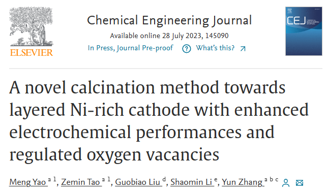 在锂离子电池高镍三元正极材料方面,通过采用氧化剂Li2O2代替锂源LiOH·H2O,使用一种新的煅烧方法制备了具有降低的氧空位和较低的Li+/Ni2+阳离子混合的LiNi0.9Co0.05Mn0.05O2正极材料。在这项工作中,详细讨论了Li2O2在富镍材料煅烧阶段结构演变中的作用,相关成果发表以“A novel calcination method towards layered Ni-rich cathode with enhanced electrochemical performances and regulated oxygen vacancies”为题,发表在著名学术期刊Chemical Engineering Journal上(中科院一区,川大B刊,影响因子15.1)。beat365中文官方网站为该论文第一通讯单位,第一作者是尧猛副研究员和beat365中文官方网站2020级硕士研究生陶泽敏,通讯作者为beat365中文官方网站张云教授。