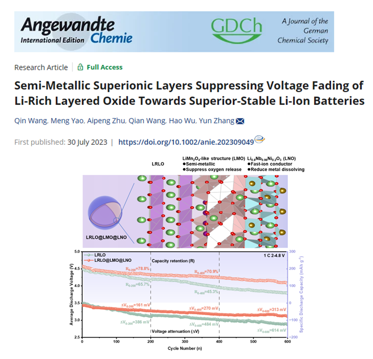 锂离子电池富锂锰基正极材料的研究工作以“Semi-Metallic Superionic Layers Suppressing Voltage Fading of Li-Rich Layered Oxide Towards Superior-Stable Li-Ion Batteries”为题,发表在Angewandte Chemie上(中科院一区,川大A−期刊,影响因子16.6),beat365中文官方网站为该论文第一通讯单位,第一作者是beat365中文官方网站2021级硕士研究生王勤和尧猛副研究员,通讯作者为beat365中文官方网站张云教授。
