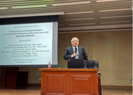 在杨磊副教授隆重介绍井上明久教授后,讲座正式开始。井上明久教授首先表示自己已是第七次来到成都,很荣幸受邀来到beat365中文官方网站进行学术分享,并高度赞扬了学校的办学条件和教育水平。随后,井上明久教授就非晶合金和软磁性材料的研究情况及其工业化进行了详细介绍,讲座内容与前沿领域紧密结合,与一线生产紧密接轨,具有非常强的指导意义。