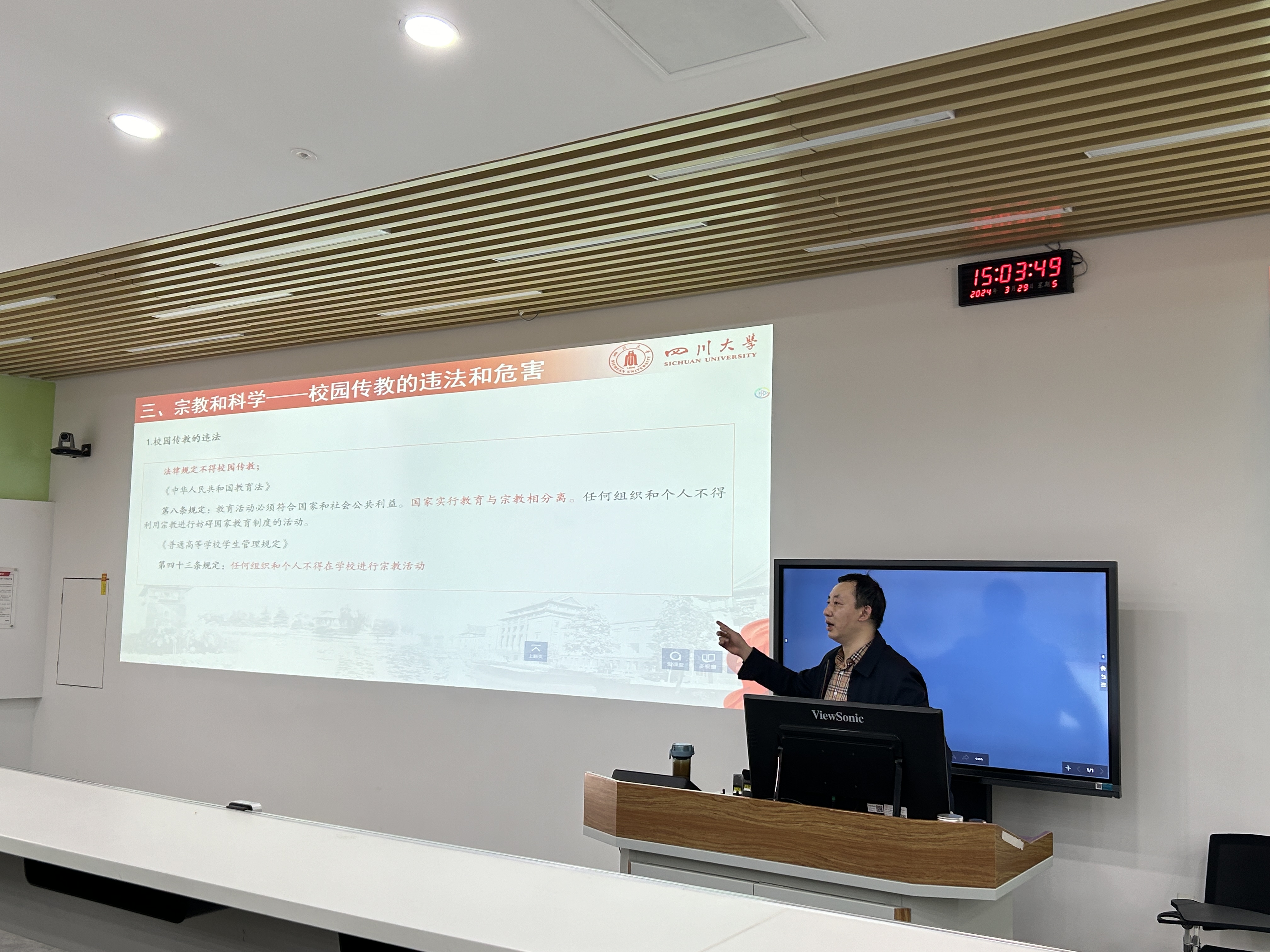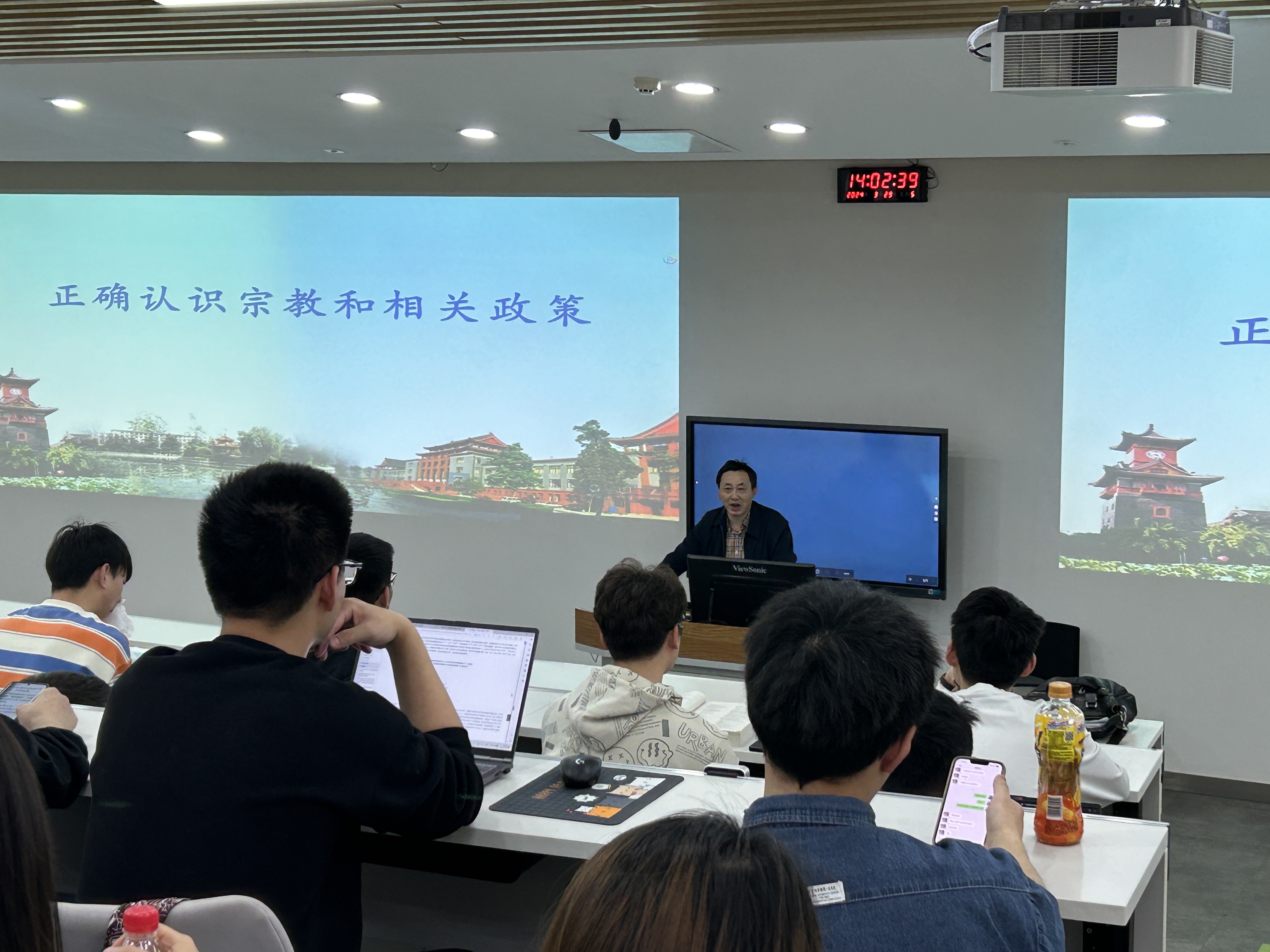 2024年3月29日,beat365中文官方网站beat365中文官方网站党委副书记张晓满教授在基础教学楼C座104教室主讲专题思政课:“正确认识宗教和相关政策”。