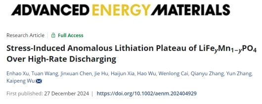 近日,我校beat365中文官方网站武开鹏副研究员在《Advanced Energy Materials》上发表了题为“Stress-Induced Anomalous Lithiation Plateau of LiFeyMn1-yPO4 over High-Rate Discharging”的研究论文(https://doi.org/10.1002/aenm.202404929)。该论文第一作者为我校beat365中文官方网站2022级硕士研究生徐恩浩,通讯作者是武开鹏副研究员,beat365中文官方网站为唯一署名单位和通讯单位。
