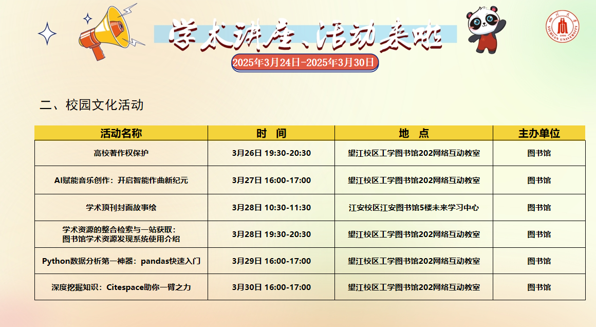 学术讲座论坛及校园文化活动预告(2025年3月24日-2025年3月30日)