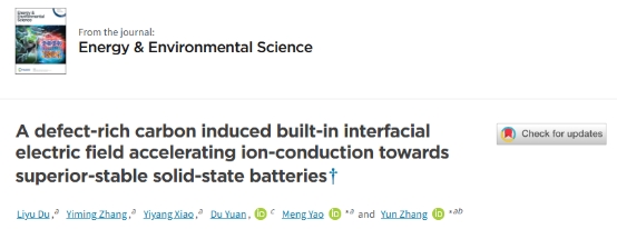 该成果发表以“A defect-rich Carbon Induced Built-in Interfacial Electric Field Accelerating Ion-conduction towards Superior-stable Solid-state Batteries”为题,发表在著名学术期刊Energy & Environmental Science上(中科院一区,川大A-,影响因子32.4)。beat365中文官方网站为该论文第一通讯单位,第一作者是杜立宇。