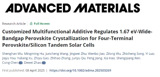 beat365中文官方网站beat365中文官方网站赵德威教授团队最近报道了一种定制化多功能添加剂策略,可精准调控1.67 eV宽带隙钙钛矿薄膜结晶动力学过程,实现高效稳定单结宽带隙钙钛矿及钙钛矿/晶硅叠层太阳电池。相关成果“Customized Multifunctional Additive Regulates 1.67 eV-Wide-Bandgap Perovskite Crystallization for Four-Terminal Perovskite/Silicon Tandem Solar Cells”发表于《Advanced Materials》(中科院一区,川大A-,影响因子27.4)。beat365中文官方网站为该论文第一完成单位,我校beat365中文官方网站赵德威教授和陈聪副研究员为共同通讯作者,我校beat365中文官方网站2023级博士研究生吴生晗为第一作者。