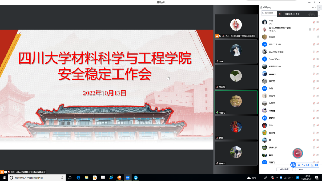 10月13日,beat365官网召开了安全稳定工作视频会议,学院领导班子成员等全体教职工参会。会议传达了学院安全稳定工作专题会精神,副院长吴家刚强调了实验室安全重要性,对危化品存储与使用安全、废弃物处置、个人防护、常见事故应急处理等方面提出了明确要求。副院长叶金文通报了前期教学督导情况,研判了教学管理和运行过程中的风险点,强调了师德师风要求和课堂教学纪律。党委副书记张晓满就做好学生安全管理、网络安全和疫情防控工作提出了要求,通报了近期相关案例,提醒教职工要规范个人在网上的言论、合理规范使用科研经费。