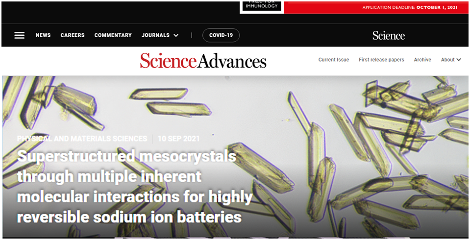 (1) Superstructured mesocrystals through multiple inherent molecular interactions for highly reversible sodium ion batteries. X. L. Qiu, X. L. Wang, Y. X. He, J. Liang, K. Liang, B. L. Tardy, J. Richardson, M. Hu, H. Wu*, Y. Zhang*, O. Rojas, I. Manners, J. Guo, Science Advances 7, eabh3482, 2021. (SCI, IF=14.98), Highlighted as Featured Image.