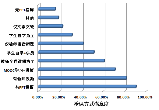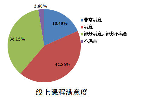 为保证线上教学质量,推进教学方式变革,第一周教学结束后,学院通过问卷星向全体学生发出调查问卷,调研学生对线上教学方法的体验和对教学效果的评价。调查结果显示,同学们对线上教学认可度比较高,有61.26 %的同学给出了非常满意和比较满意的评价。针对在线授课平台的使用,学生对QQ群课堂、腾讯会议和SPOC/MOOC课程的满意度比较高;对教师使用QQ群视频直播、QQ群PPT投屏音频直播、使用SPOC课程资源的授课形式满意度较高。大部分同学觉得线上学习很方便,不受地点的限制,课后也可以反复学习,有助于查漏补缺,不用再为错过重点而懊恼,但是缺少了课堂氛围和老师的监督,对自身的自觉性和自制力提出了考验。希望借此机会,在学习知识的同时增强自己的自制力与自觉性。学生在问卷调查中,也对授课平台种类较多需要不断切换平台、网络卡顿影响直播授课效果等提出了建议和意见。