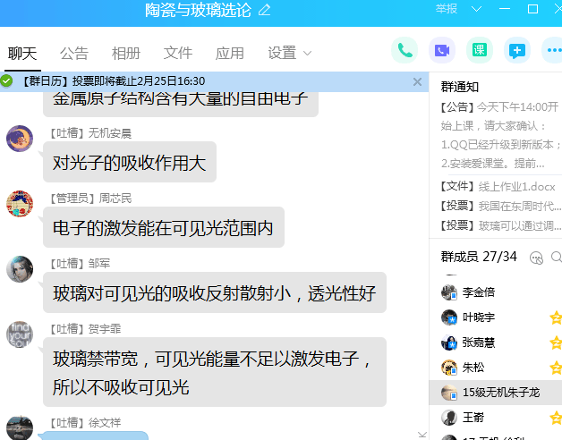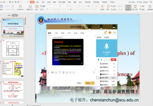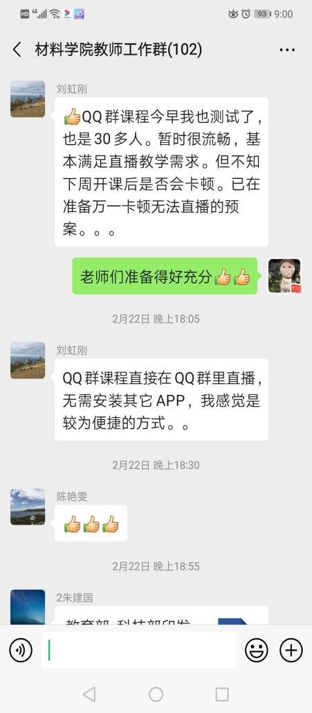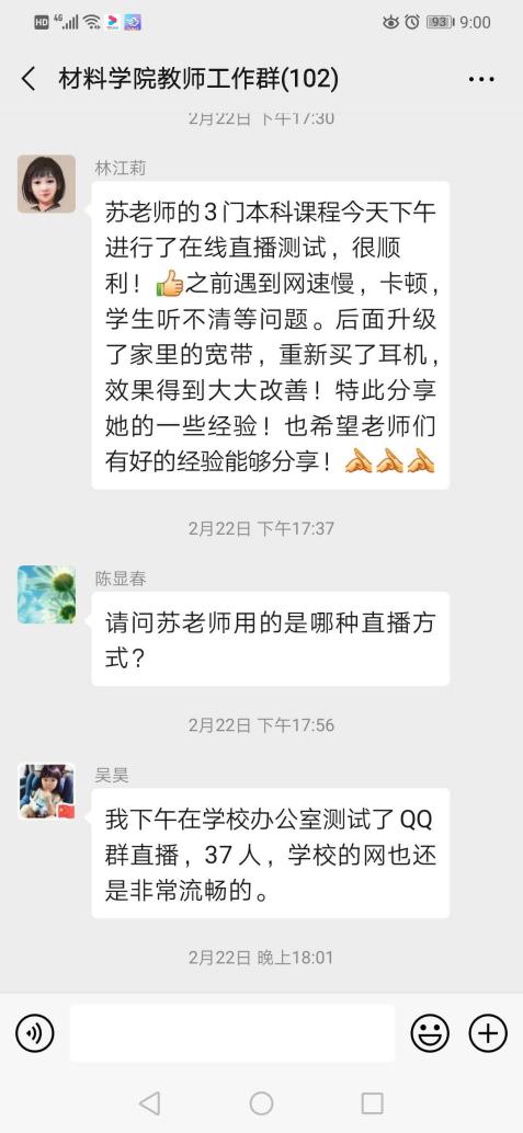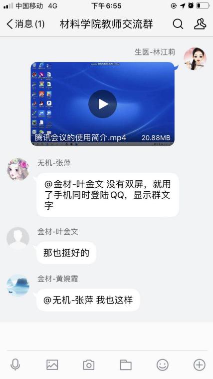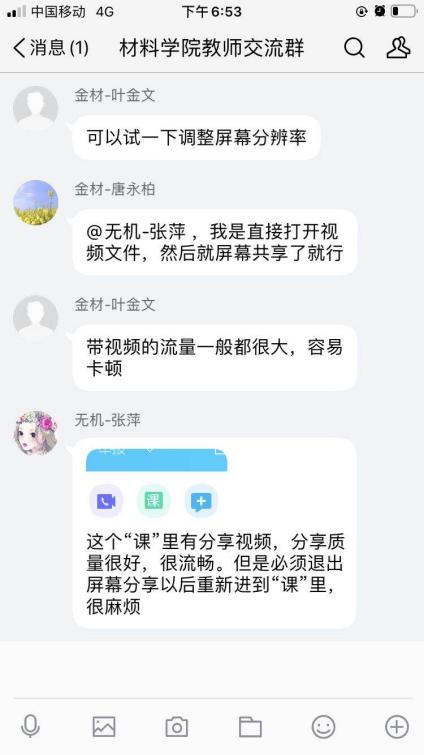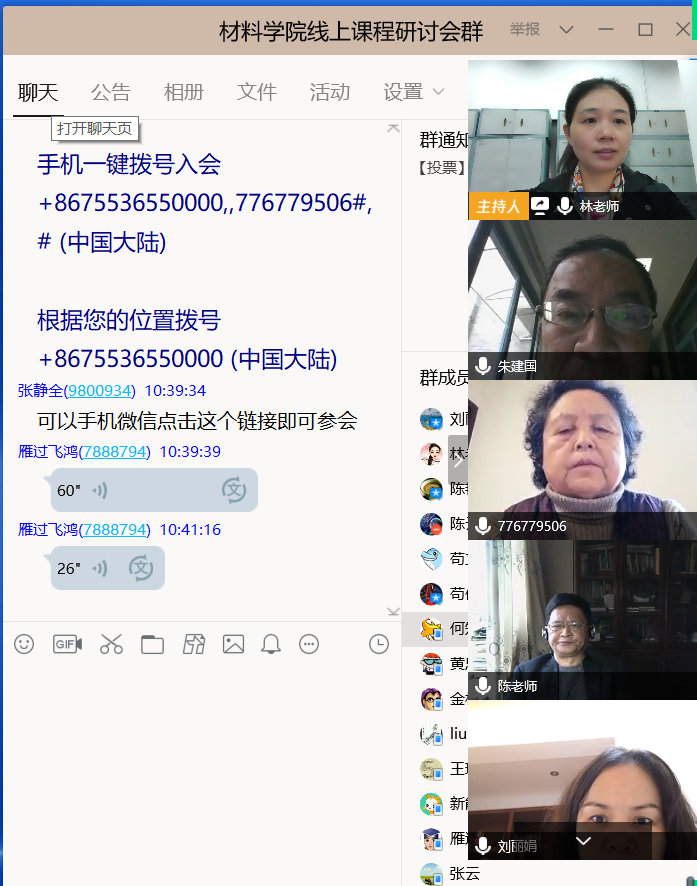 在培训交流会上,学院教学副院长林江莉教授和金属材料系叶金文教授分别分享了腾讯会议平台授课和QQ群投屏PPT双屏授课的经验,院内老师就如何实现教学工具的切换、如何调动学生主动性、如何保证教学互动效果与及时性等问题,在学院工作群里展开了热烈的讨论和交流。