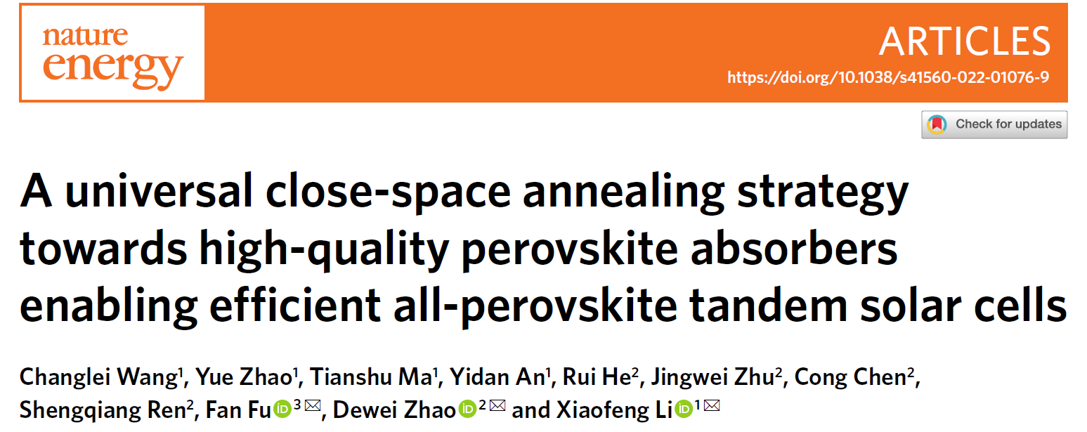 北京时间2022年7月21日,国际顶尖学术期刊Nature Energy在线发表了beat365官网太阳能所赵德威教授、苏州大学李孝峰教授和瑞士联邦材料科学与技术研究所(EMPA)付帆博士合作团队题为“A universal close-space annealing strategy towards high-quality perovskite absorbers enabling efficient all-perovskite tandem solar cells”的研究成果。合作团队提出了限域退火方法制备高质量钙钛矿结晶薄膜的策略,并且该方法对于不同组分钙钛矿薄膜具有普适性,最终实现了效率超过25%的全钙钛矿叠层太阳能电池。