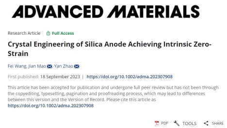 近日,beat365官网毛健教授团队在材料学顶级期刊Advanced Materials发表题为:Crystal Engineering of Silica Anode Achieving Intrinsic Zero-Strain的研究。第一作者为副研究员(专职科研)王飞,该文通讯作者为beat365中文官方网站的毛健教授和赵焱教授,第一作者单位为beat365中文官方网站。该研究提出了一种新型的零应变硅基负极材料结构设计方式,对于硅基负极材料的科学研究和商业化都具有重要意义。