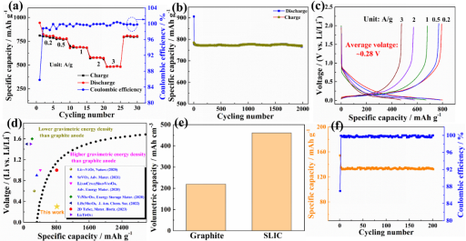 图2. SLIC(a)倍率性能、(b)循环性能和(c)充放电曲线图;(d)SLIC的质量能量密度和(e)体积能量密度稍微比较;(f) SLIC||LiFePO4全电池的循环性能图