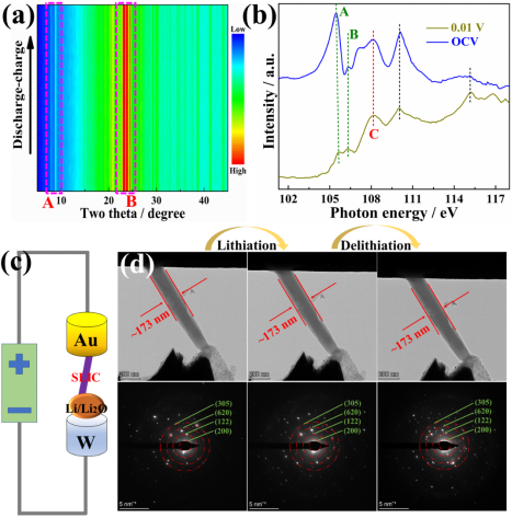 图3. (a)SLIC充放电时的原位XRD图;(b)SLICOCV和0.01V时的Si L-edge XANES谱图;原位TEM(c)测试装置图和在充放电过程中的(d)形貌和SAED