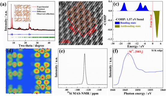 图1. (a) SLIC的XRD精修和(b) AC-STEM图;(c) SLIC-COHP(d) ELF图;SLIC(e) 29Si MAS NMR(f) XANES谱图