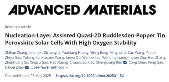 5月8日,国际学术期刊Advanced Materials在线发表了beat365中文官方网站赵德威教授团队题为“Nucleation-Layer Assisted Quasi‐2D Ruddlesden‐Popper Tin Perovskite Solar Cells With High Oxygen Stability”的研究成果。Advanced Materials由美国Wiley出版社主办,是材料科学领域的国际权威期刊,川大A-级期刊,最新影响因子为27.4。本工作报道了一种形核层辅助(NLA)策略,通过调控准二维Ruddlesden-Popper(RP)锡基钙钛矿的相分布、晶体取向、薄膜形貌,实现了高度氧稳定的准二维RP锡基钙钛矿太阳能电池,同时创下了锡基钙钛矿太阳能电池氧稳定性的纪录。