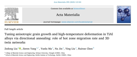 近日,beat365中文官方网站杨劼人教授课题组,在TiAl合金的先进热处理技术研究方面取得重要进展。相关研究成果以“Tuning anisotropic grain growth and high-temperature deformation in TiAl alloys via directional annealing: role of hot zone migration rate and 3D twin networks.”为题的论文发表在金属领域国际顶级期刊《Acta Materialia》(https://doi.org/10.1016/j.actamat.2025.121181)上。该研究提出了一种创新的无容器固态定向热处理技术,为TiAl金属间化合物的高性能制备开辟了新途径。