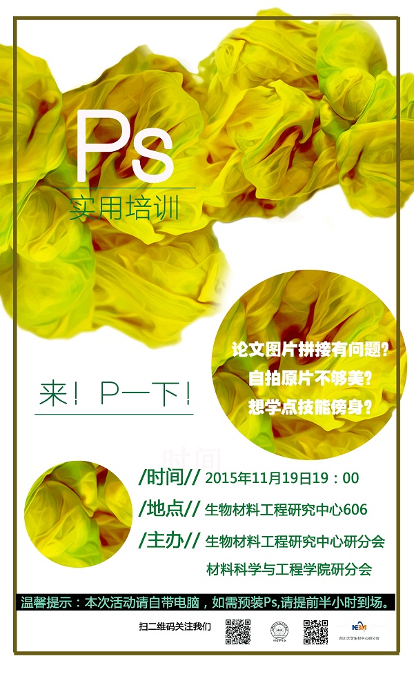 照片有点小瑕疵?没事,交给Photoshop吧!论文图片需要些许修改?也没事,快来Photoshop吧!想把这些乱七八糟的干干净净、整整齐齐的排在一起,不会啊,快来Photoshop啊!本周四晚上7点,生材中心,让我们来学习如何用Photoshop把我们的图片变得美观、漂亮、大方!