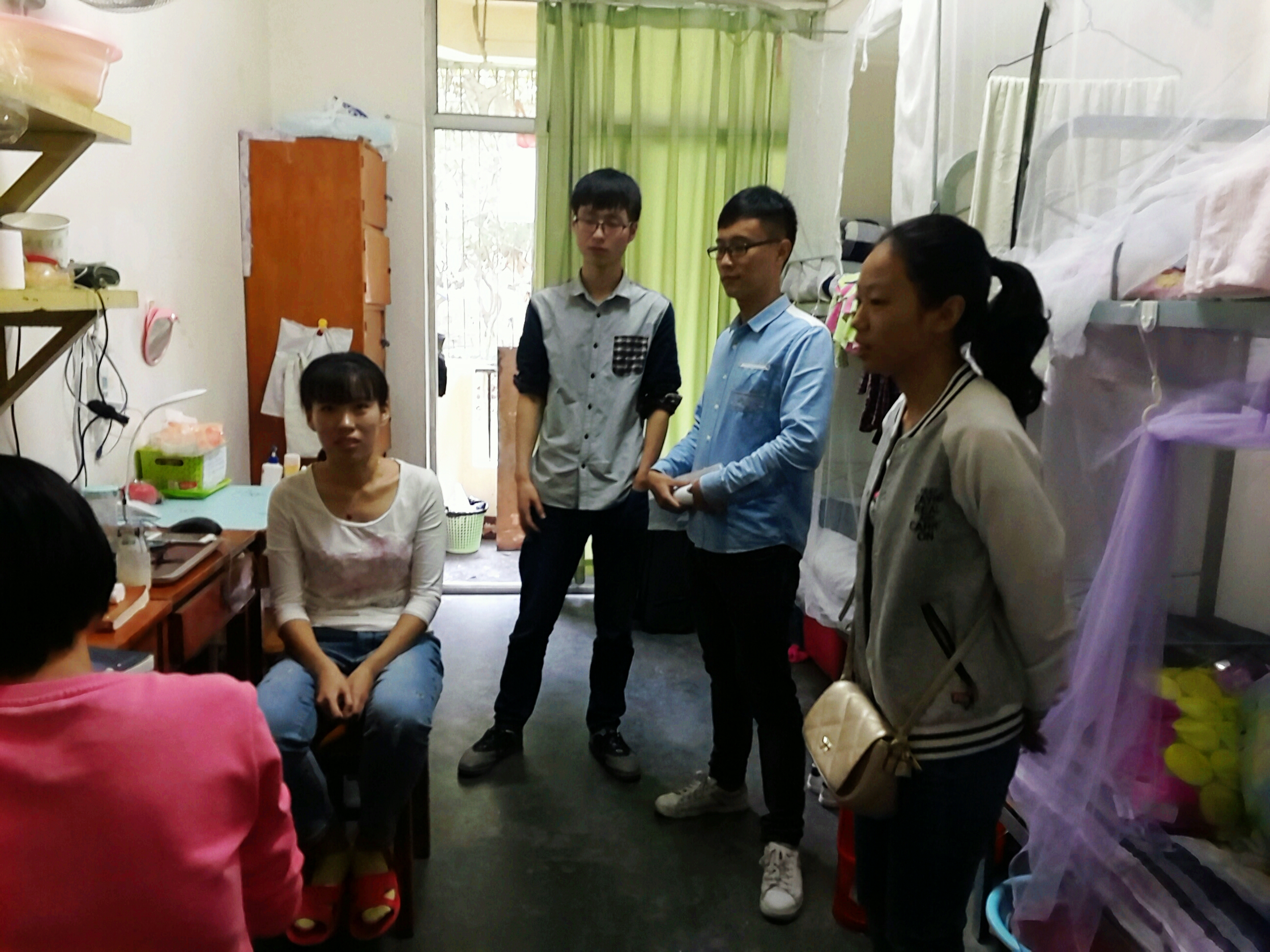 2016年9月20、21日,beat365中文官方网站研分会主席团成员周龄童、来豪杰、刘莎莎、赵潇、魏宇航作为研分会的代表在绵绵秋雨后走访了2016级beat365中文官方网站硕士新生寝室,表达了对2016级beat365中文官方网站新入学硕士新生的关心与问候。