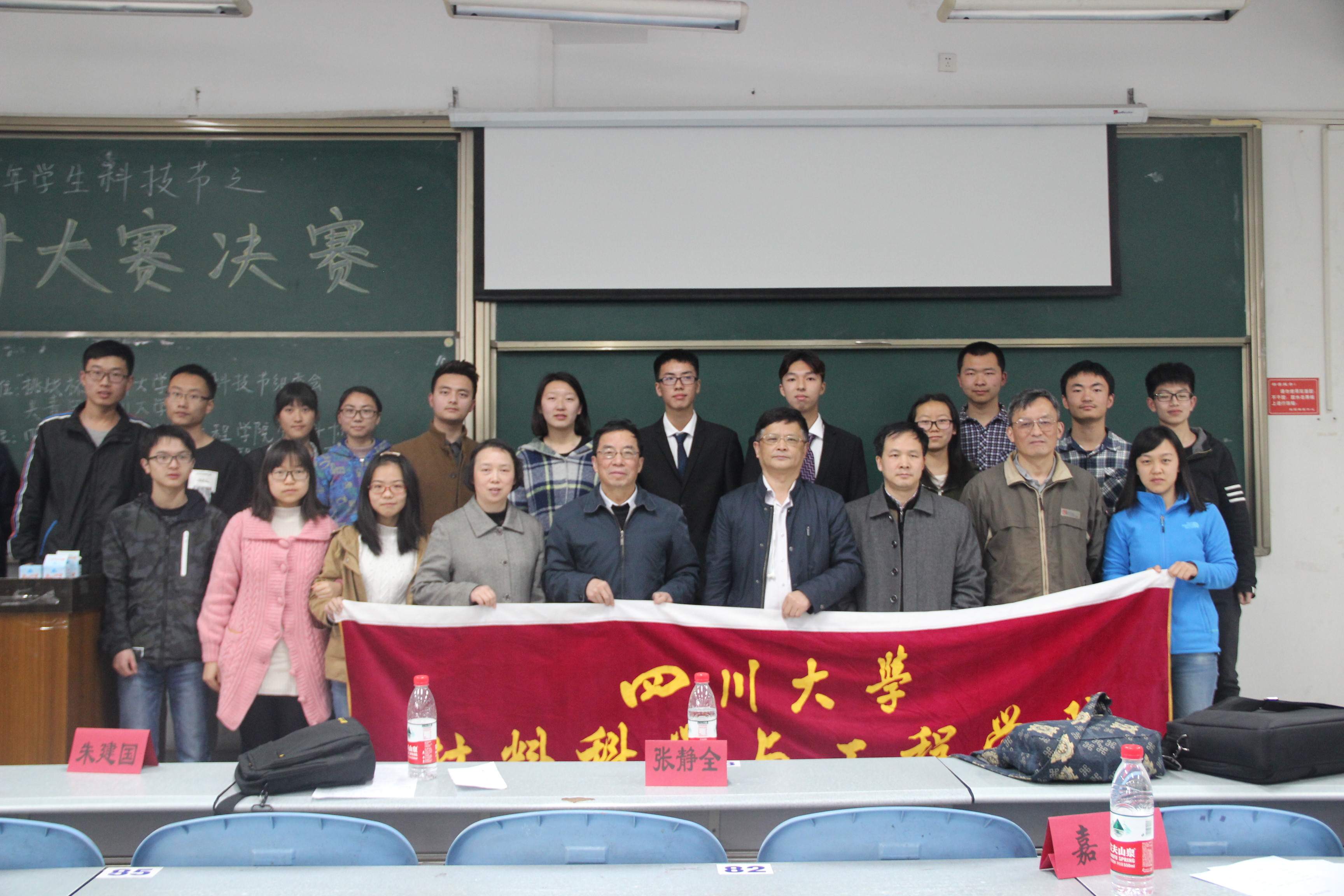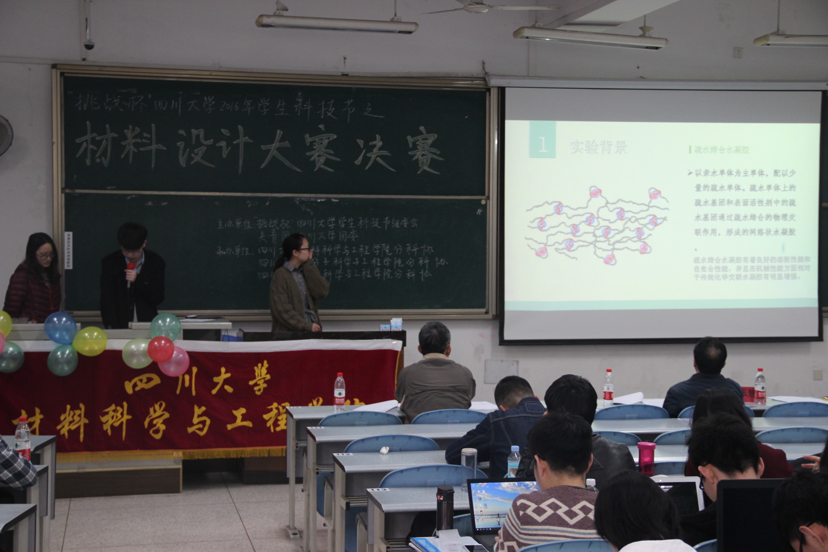 2017年3月26日,由beat365中文官方网站分团委学生学术科技协会,高分子科学与工程学院分团委学生学术科技协会和制造科学的工程学院分团委学生学术科技协会三个部门联合承办的“挑战杯”——beat365中文官方网站2016学生科技节之材料设计大赛决赛在江安校区综合楼C座307教室顺利举行。大赛评委有beat365中文官方网站党委书记朱建国教授,副院长孙小松教授,无机生医系主任芶立教授,新能源材料系主任陈云贵教授,材料科学系主任张静全教授,beat365中文官方网站党委副书记唐世红老师与院分团委书记王娇老师也出席了本次大赛。beat365中文官方网站院长尹光福教授虽然未到场,但是也表示了对本次大赛顺利举行的祝愿。