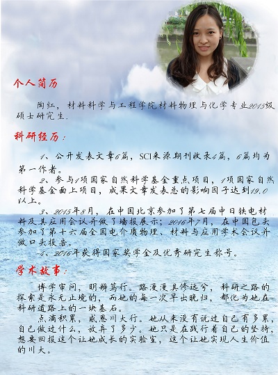 陶红同学,beat365中文官方网站硕士二年级学生,于2011年进入beat365中文官方网站材料科学系,后经免试推荐保送至本校硕士研究生,师从吴家刚教授,从事无铅压电陶瓷的性能调控及物理机理研究。她作为主要研究人员,参与了国家自然科学基金重点项目及面上项目,目前以第一作者发表论文6篇,其中SCI收录论文4篇,综合影响因子达19.0以上。同时,陶红同学获得了2016年国家奖学金及优秀研究生称号,在2015年于北京参加了第七届中日铁电材料及其应用会议并做了墙报展示,在2016年于中国包头参加了第十六届全国电介质物理、材料与应用学术会议并做了口头报告。