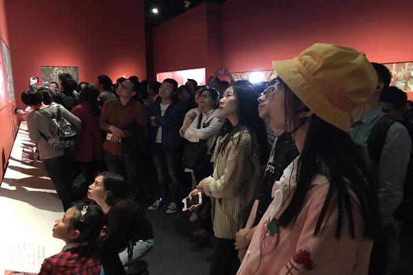 随后,另外一位讲解员带领大家走进了丝绸之路展厅。在这个展厅,同学们了解到了敦煌艺术的由来及后续发展,古人作画的手法特征及色彩运用技巧,同时,风趣幽默的讲解员也通过一幅幅栩栩如生的壁画为大家讲述了一个个生动的故事,使得参观的氛围变得十分活泼。
