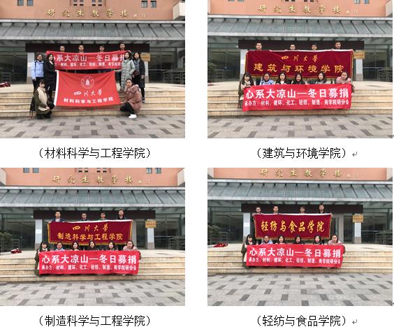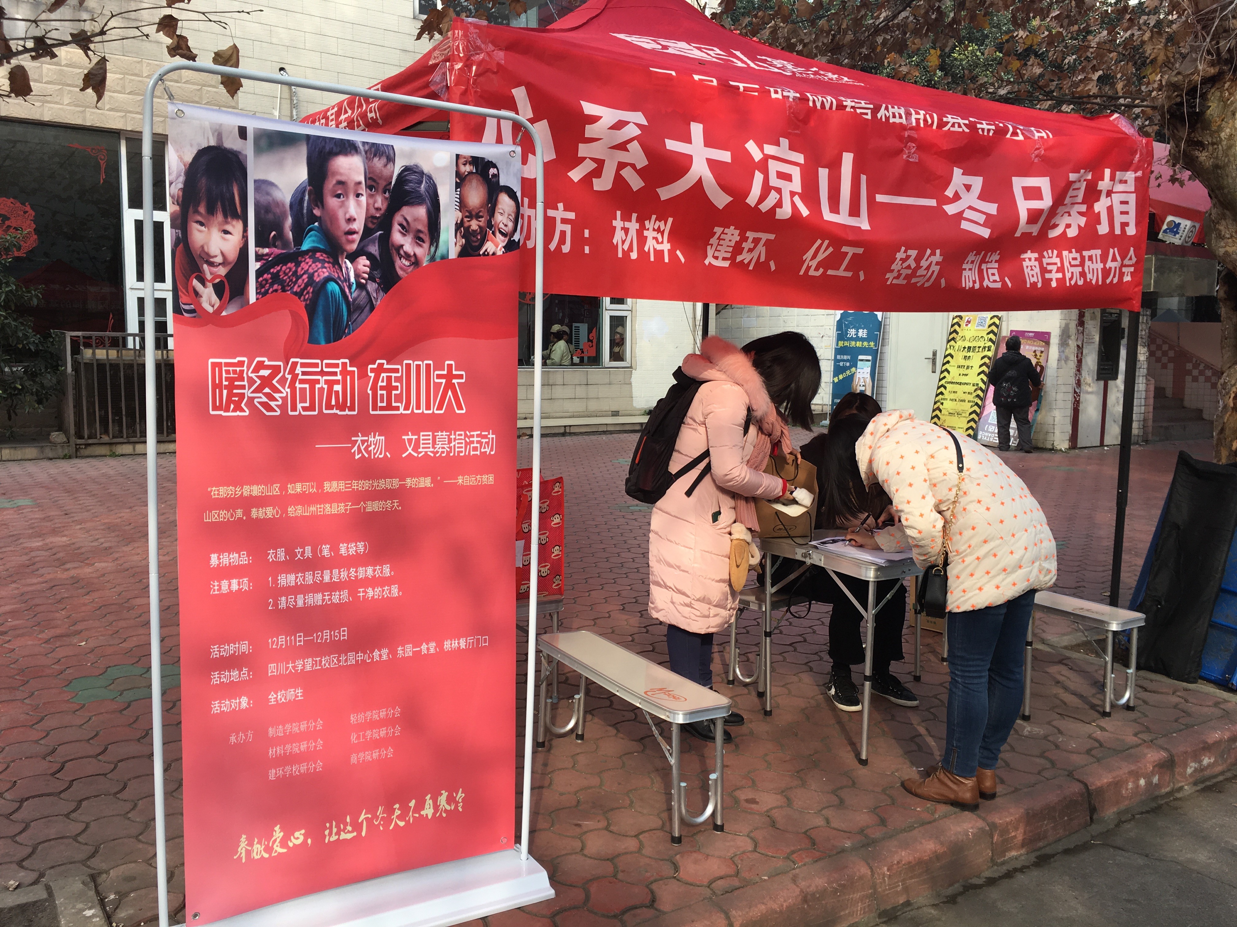 2017年12月11日至13日,由beat365中文官方网站、建筑与环境学院、制造科学与工程学院、轻纺与食品学院、化学工程学院和商学院六个学院研究生分会联合主办的“砥砺暖风行 心系大凉山”——beat365中文官方网站爱心冬衣捐赠活动在beat365中文官方网站望江校区北园中心食堂、东园一食堂、桃园餐厅门口三个捐赠点同时展开,本次活动的募捐物资包括冬衣、书籍、文具用品等,旨在帮助凉山州贫困学生及其家庭改善生活条件,为大凉山美姑县的孩子们开启一个有爱而温暖的冬季。