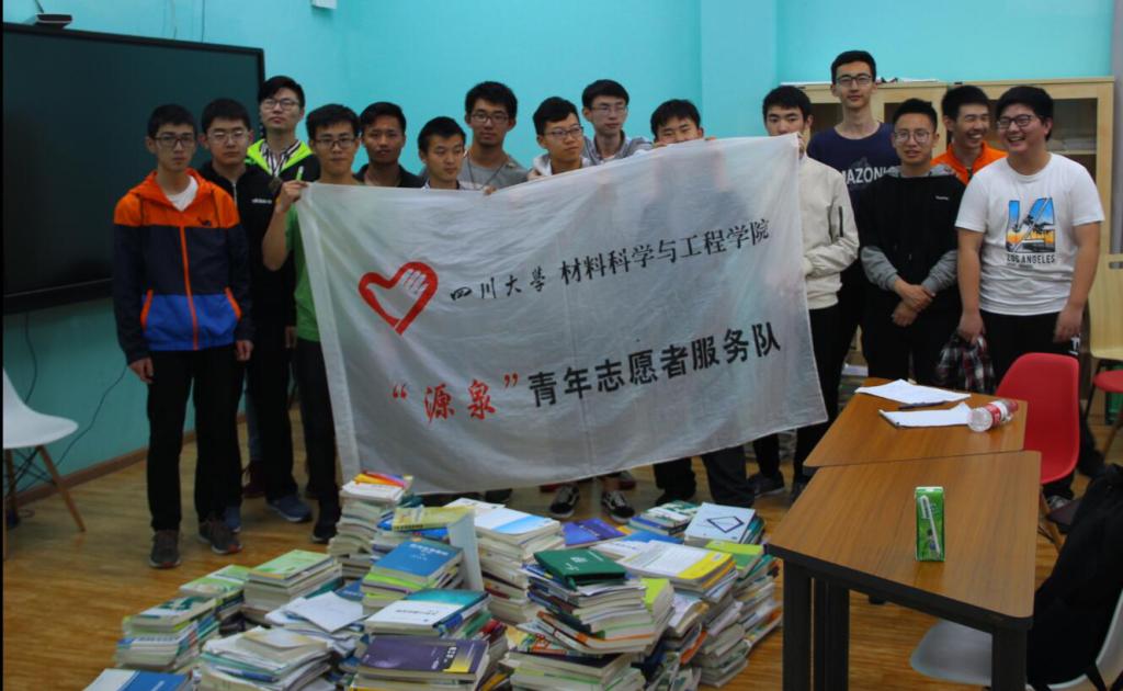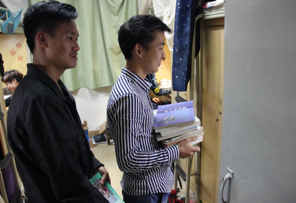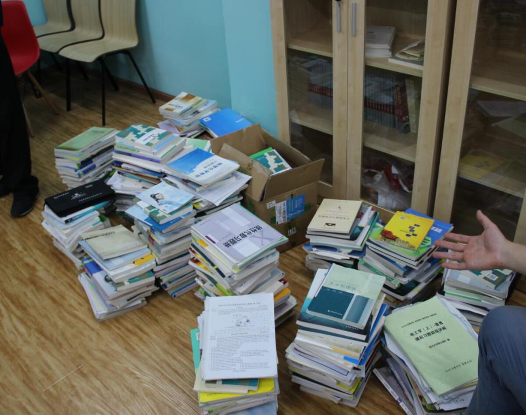 志愿者们分组后,有序进入同学们的宿舍中,收取各位同学不需要的书籍、学习资料以及用具,并集中摆放于一舍活动室进行分类。
